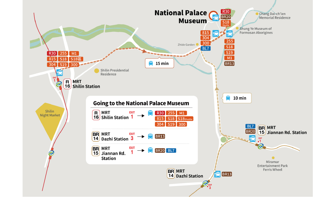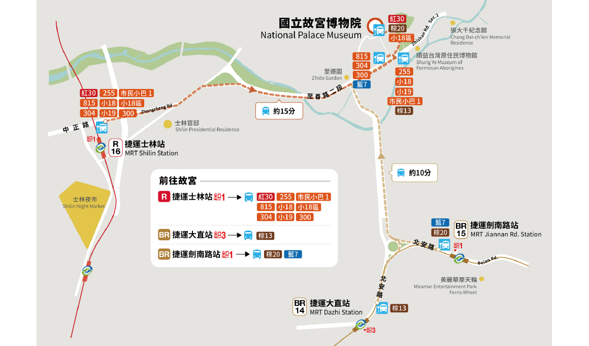 - Take theTamsui-Xinyi Line to Shilin Station and then take a transfer bus Walk from Exit 1 of Shilin Station R16 for approximately 1-2 min to arrive at the bus stops on Zhongzheng Rd.; take Bus R30/紅30, 815, 304, 300, 255, S19/小19, S18/小18, or M1/市民小巴1 to the National Palace Museum (bus travel time is approximately 15 min)